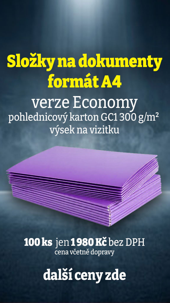 Nově jsme do nabídky zařadili tisk firemních složek Economy. Tvar výseku je optimalizován tak, aby se úsporněji vlez na tiskový arch. Tisk těchto prezentačních desek A4 je na pevný pohlednicový karton GC1 300 g/m², 100% celulóza, jednostranně dvakrát natíraný. Povrch tohoto kartonu je tvrdý a hlazený, zadní vnitřní strana je matná, dobře popisovatelná. Složky mají výsek na vizitku.